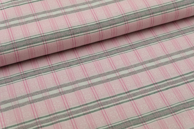 Beschreibung Motiv: leichter Baumwollstoff mit eingewebtem Karo- und Blümchenmuster in weiß, rose und schilfgrün. Eignet sich für Blusen, Kleider, Röcke, Trachtenmode und Landhausstil. |