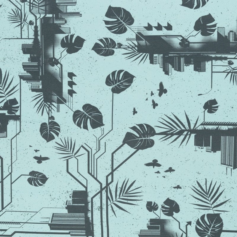 Grundfarbe: ged. mint City-Elemente verschmelzen mit Dschungel-Pflanzen zu einem einzigartigen grafischen Muster, das quasi in allen Himmelsrichtungen spannende Perspektiven bietet.