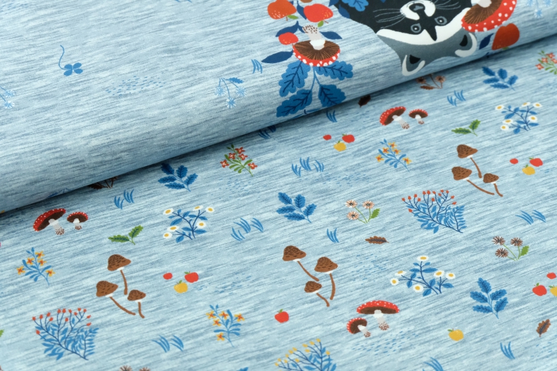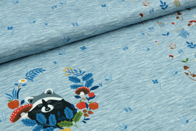 Grundfarbe: blau meliert Motiv: Der Kuschelsweat mit flauschig angerauter Kuschelabseite ist zweigeteilt: Der Teil mit dem Waschbär im Kranz (18 cm breit) kann für das Vorderteil verwendet werden, mit der anderen Stoffhälfte mit weiteren Waldmotiven haben Sie den perfekten Kombinationspartner für Rückenteil oder Ärmel.